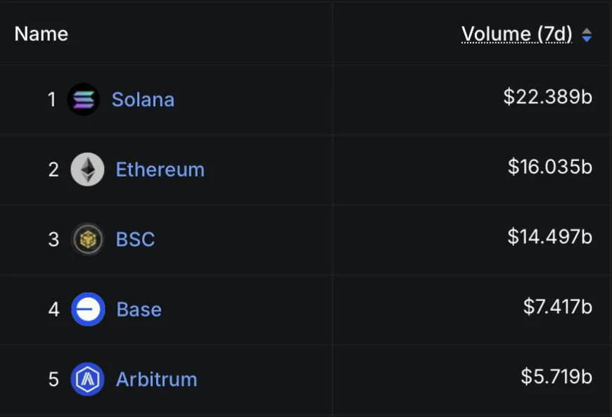 In a remarkable show of strength, Solana has recorded $22.39 billion in decentralized exchange (DEX) volume over the past seven days, surpassing all other blockchains, including Ethereum. This marks a significant moment for the Layer-1 protocol, often dubbed the "Ethereum killer," as it proves its dominance in high-speed, low-cost decentralized trading.